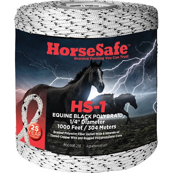 Introducing the HorseSafe Braided Electric Fence Wire (HS-1) from AgraTronix, the premium solution for permanent and semi-permanent fencing of horses. This highly visible braided polywire is designed with a rugged polypropylene core that resists unraveling or breaking, ensuring lasting durability. The white and black speckled braid makes the fence wire more visible than standard smooth wire, effectively deterring horses and other animals. The six strands of highly conductive tinned copper ensure optimal performance throughout the fence wire, providing excellent shock conductivity. The HS-1 also features more UV protection than competitors, ensuring longer life. This lightweight and easy-to-install electric fence wire comes in a roll of 1000 ft and includes a range of accessories such as connecting cables, U-clamps and bolts, and a solar panel with a connector. Choose the HS-1 for a reliable and effective solution for keeping horses in designated spaces.